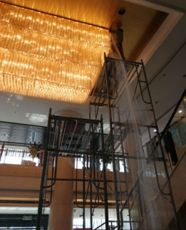 大厅吊灯使用年限较长,,,,,,部分灯源已“长眠”。。。。。。。。水晶吊灯发散着阴晦的灯光,,,,,,大厅笼罩在橘光中,,,,,,失去了原先的温暖,,,,,,宛如站在十字路口不知偏向的孩子一样孤零零的。。。。。。。。旅馆不肯把这种孤苦的感受转达给游客,,,,,,决议在不影响团队聚会和旅馆正常营业的情形下替换灯源。。。。。。。。
