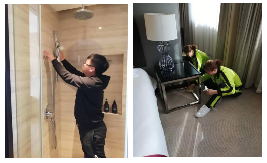客房部全体员工在客情淡的时间段对旅馆客房的卫生间门框、台盆前挡板、踢脚线、护角条、淋浴喷头、落地灯杆等五金件举行维护保养。。。。。。